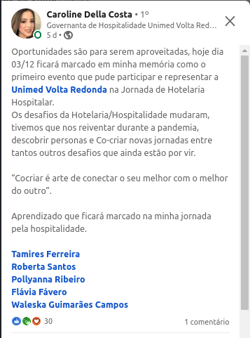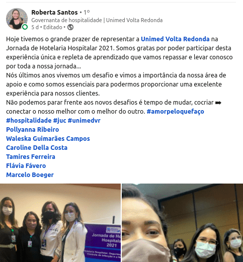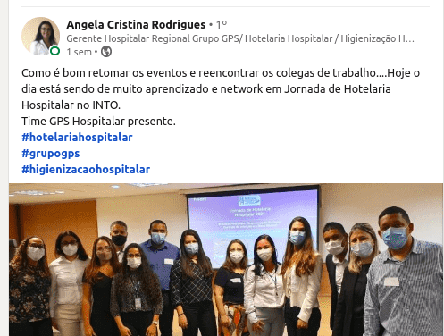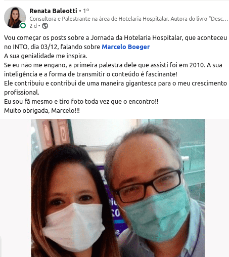 “A união entre a Hotelaria e o Controle de Infecção é um dos segredos para o sucesso da segurança dos processos. E todos ganharão com isso! Os profissionais com o equilíbrio da saúde mental e física. E o paciente, que deve ser visto como número 1 em todos os nossos processos. Então, deu match!”